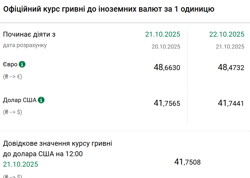 Так, на середу 22 жовтня, Нацбанк встановив офіційний курс на рівні 41,74 гривні за один долар. Офіційний курс у вівторок становив 41,75 гривні за один долар. На готівковому ринку долар не змінився — 41,95 гривні.