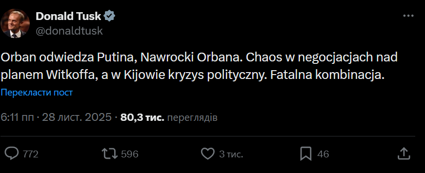 "Хаос у переговорах щодо плану спецпредставника американського президента Стів Віткоффта та політична криза в Києві. Катастрофічне поєднання", — вважає польський посадовець.