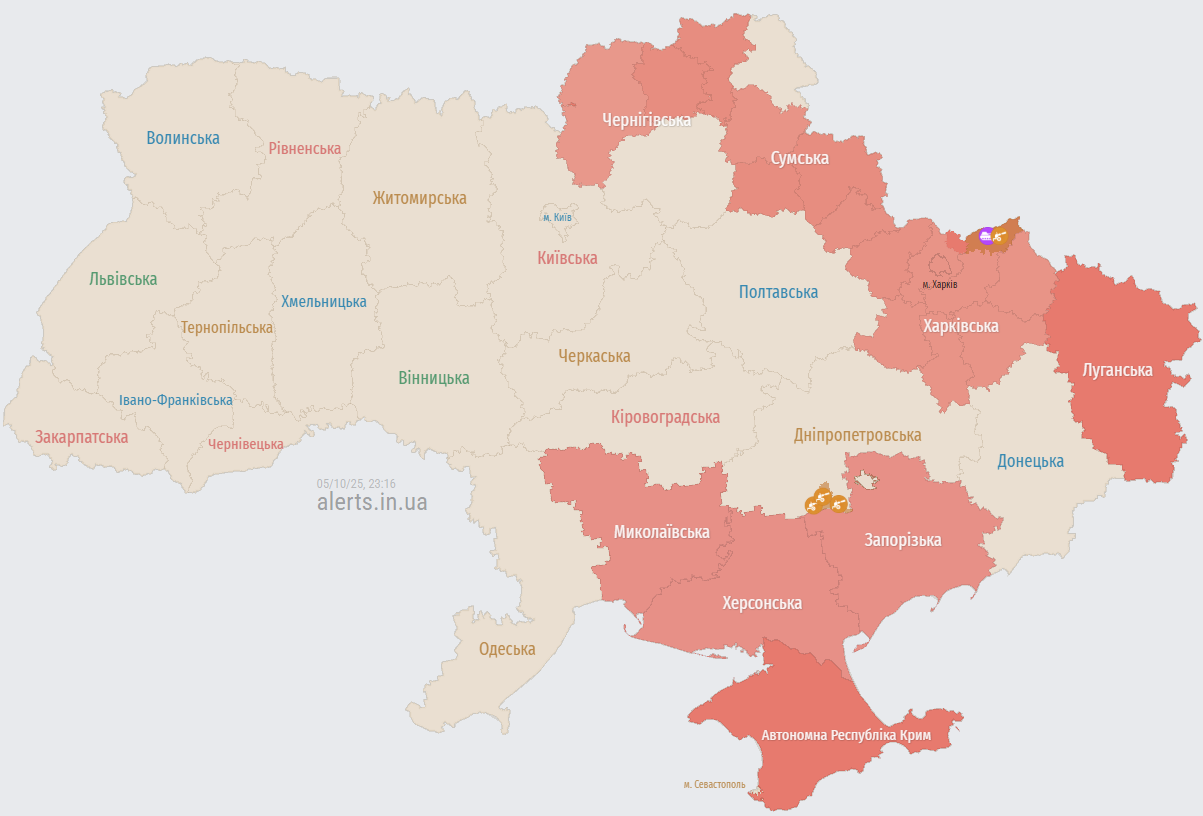 Мапа повітряних тривог станом на 23:15 має такий вигляд:
