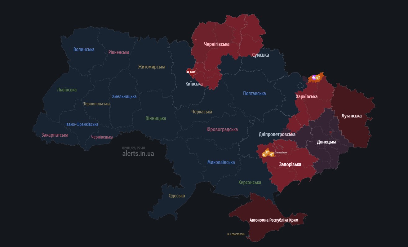 Ввечері 2 січня у столиці України оголосили повітряну тривогу. Причина — загроза ударних дронів.