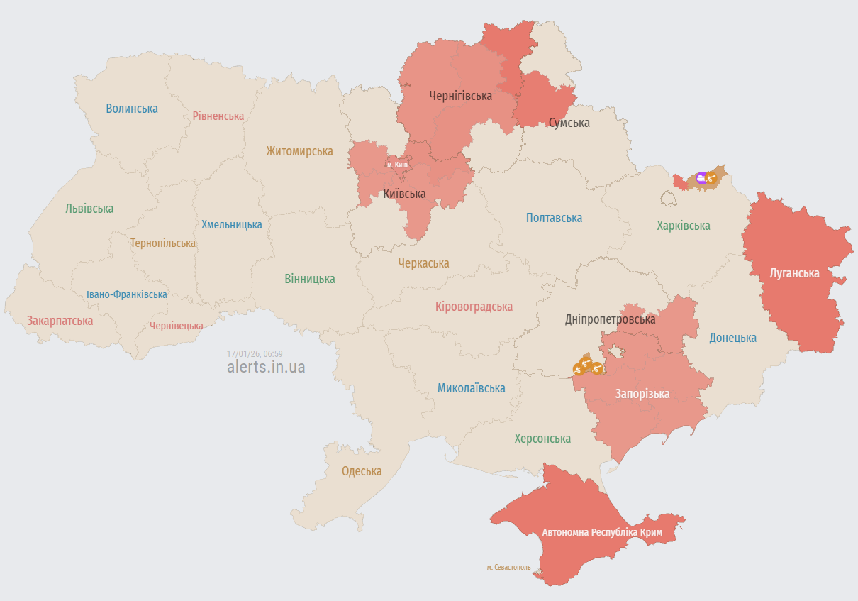Ранок суботи, 17 січня, розпочався з повторної повітряної тривоги у столиці та низці регіонів країни. Сирени пролунали через чергову загрозу застосування ворожих безпілотників.