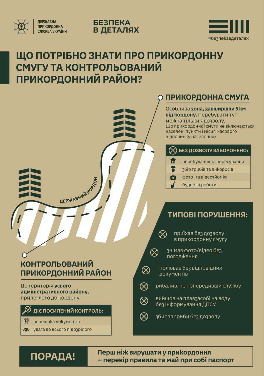 Прикордонна смуга — це ділянка завширшки 5 км від державного рубежу. Щоб перебувати у ній, потрібно отримати відповідний дозвіл у прикордонників. Що для цього потрібно? Написати звернення до прикордонного загону, на ділянці якого плануєте перебувати, та надати копії документів, що підтверджують особу та мету перебування у визначеному районі.