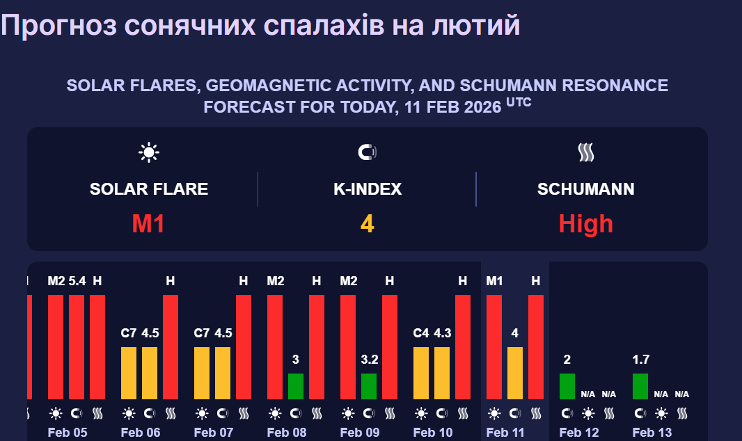 У четвер, 12 лютого, суттєвих магнітних бур на Землі не очікується. Геомагнітне поле буде спокійного рівня, а сонячна активність — помірною.