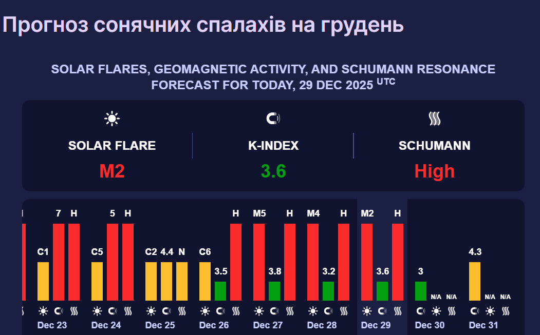 У вівторок, 30 грудня, потужних магнітних бур не очікується. Сонячна активність буде низькою, а геомагнітне поле — спокійного рівня.