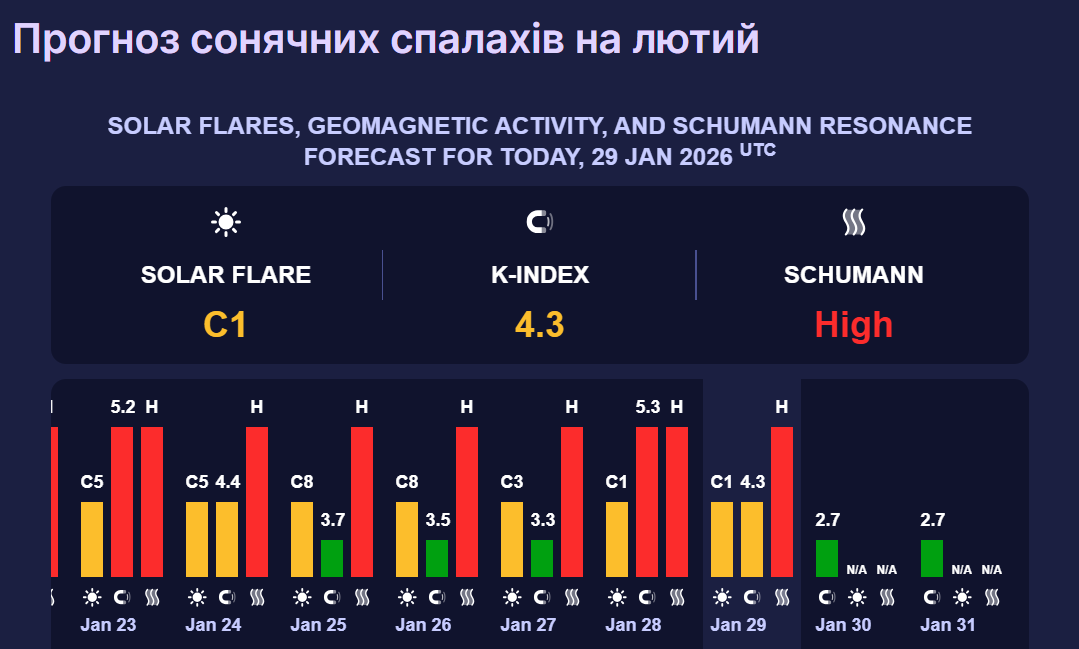 У п'ятницю, 30 січня, потужних магнітних бур не очікується. Сонячна активність буде низькою, а геомагнітне поле — спокійного рівня.