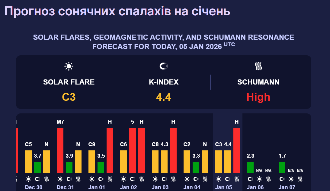 У середу, 7 січня, сонячна активність спаде до 1,7 бала, що відповідає магнітній бурі зеленого рівня. Такий шторм теж вважається низьким.