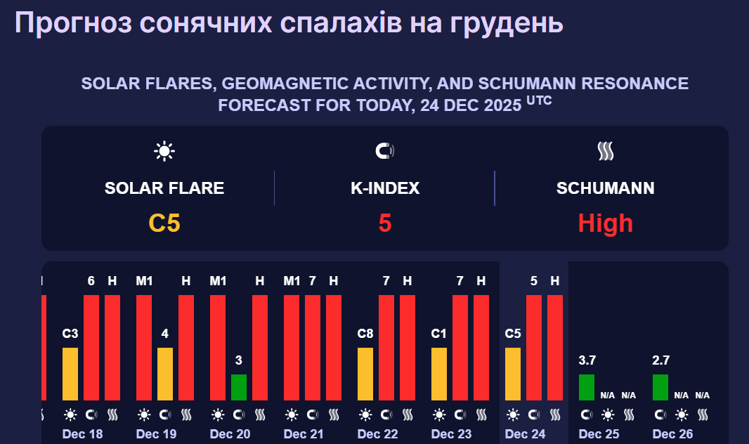 У п'ятницю, 26 грудня, сонячна активність спаде до 2,7 бала, що також відповідає магнітній бурі зеленого рівня.