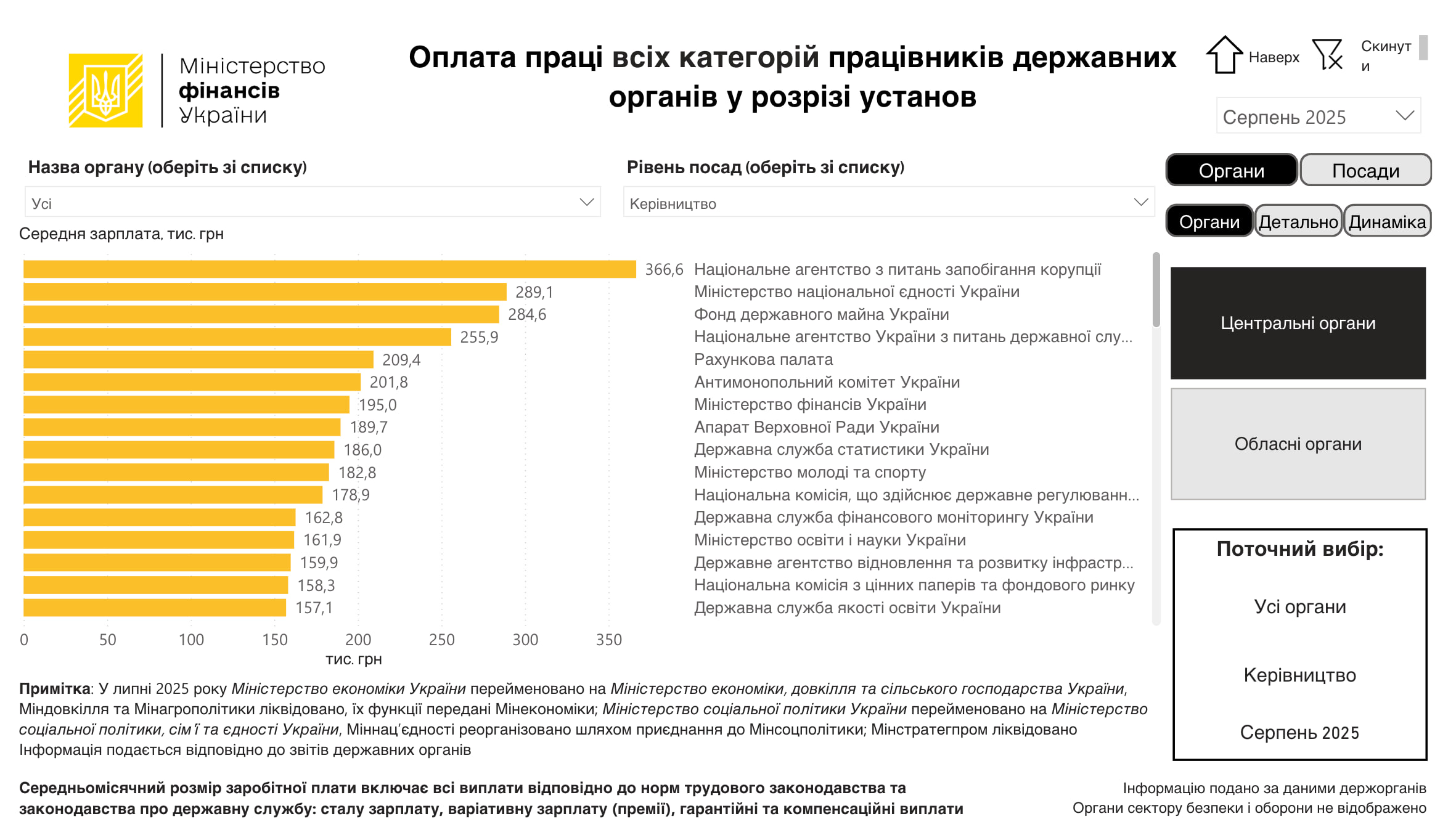 За рівнем зарплат лідирує Національне агентство із запобігання корупції (НАЗК) — 366,6 тисячі гривень. У держоргані працевлаштовано понад 350 осіб.