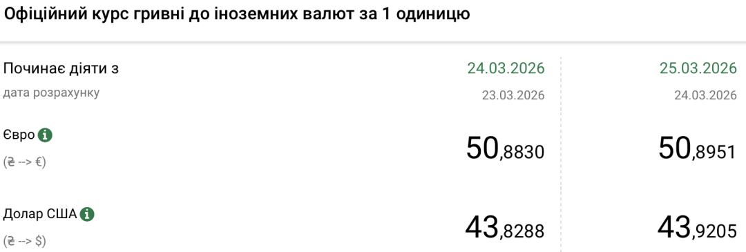 Національний банк України встановив на середу, 25 березня, офіційний курс на рівні 43,92 гривні за долар. Таким чином українська валюта послабилася на дев’ять копійок.