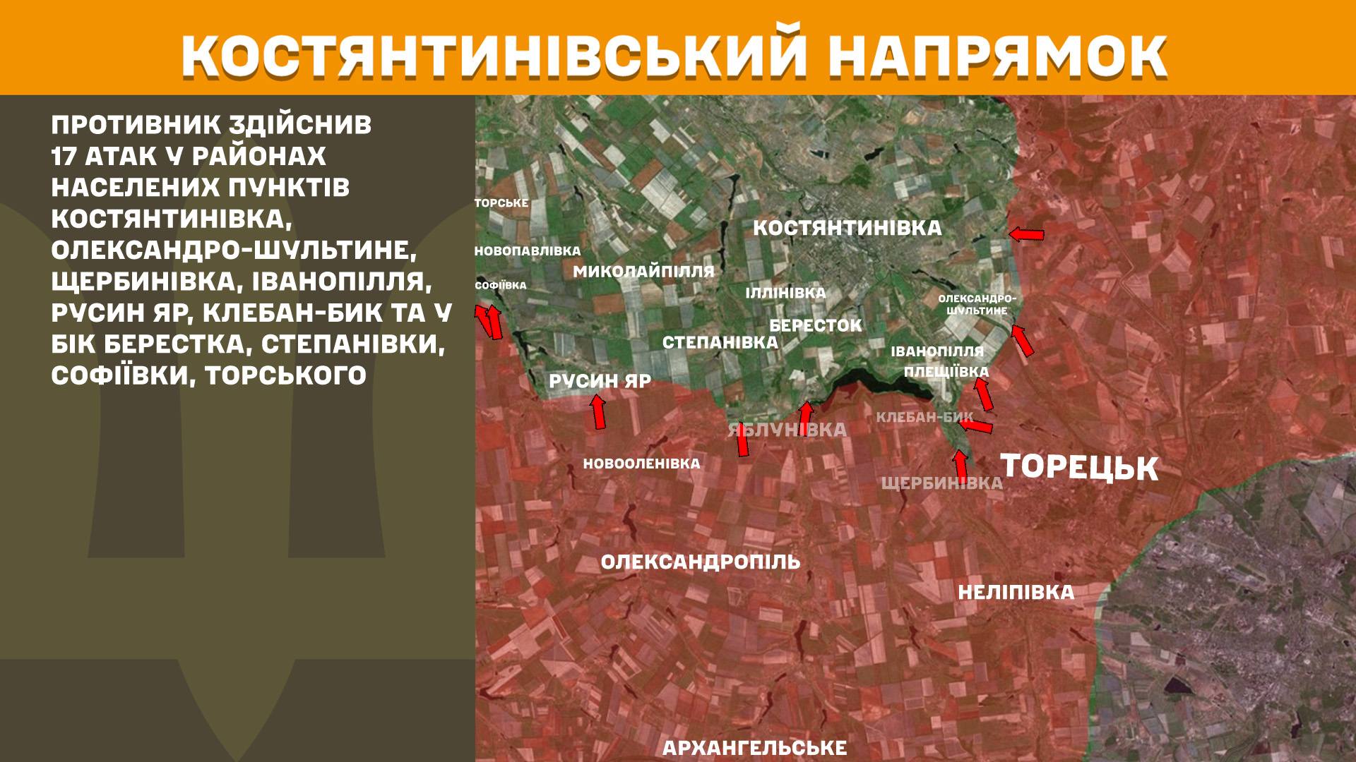 На Костянтинівському напрямку противник здійснив 17 атак у районах населених пунктів Костянтинівка, Олександро-Шультине, Щербинівка, Іванопілля, Русин Яр, Клебан-Бик та у бік Берестка, Степанівки, Софіївки, Торського.