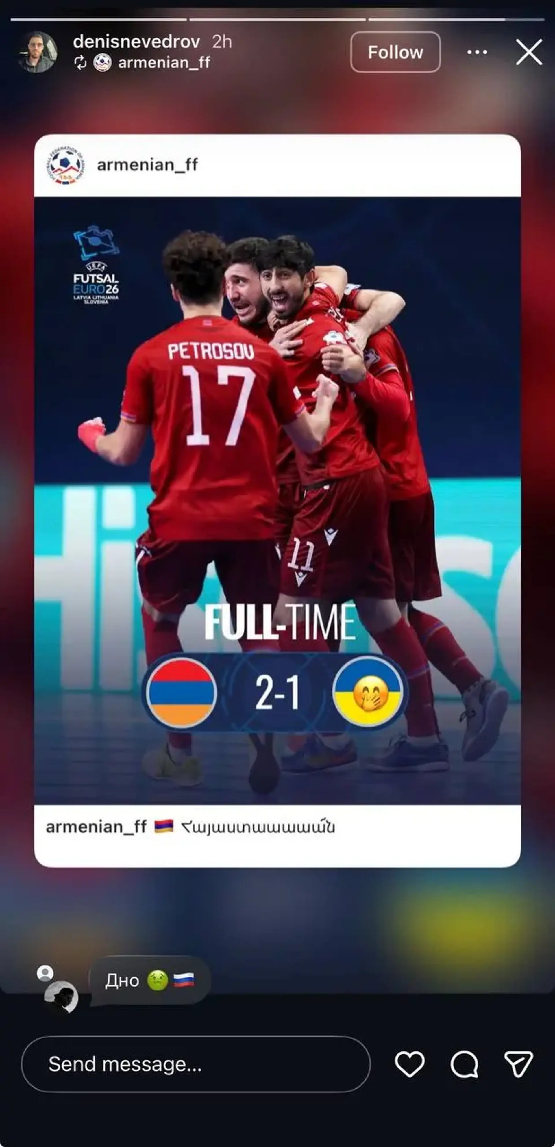 Гравець збірної Вірменії Денис Нєвєдров опинився в центрі гучного скандалу через зневажливу поведінку на адресу України після поєдинку першого туру футзального Євро-2026. Матч завершився сенсаційною поразкою української збірної від дебютантів турніру з рахунком 1:2. Під час святкування перемоги Нєвєдров навмисно вигукнув у камеру образи: "Лохи, Україна. Лохи, н***й".
