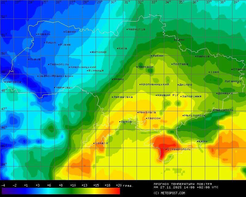 За її прогнозом, найхолодніше сьогодні буде у західних областях — лише +2…+6°С, а найтепліше у південній частині — +12…+16°С. В Криму прогріє до +15…+20°С. У північних областях стовпчики термометрів піднімуться до +6…+11°С, на Сході України — до +8…+12°С. У Центрі очікується +10…+13°С, лише на Вінниччині буде холодніше — +5…+7°С.