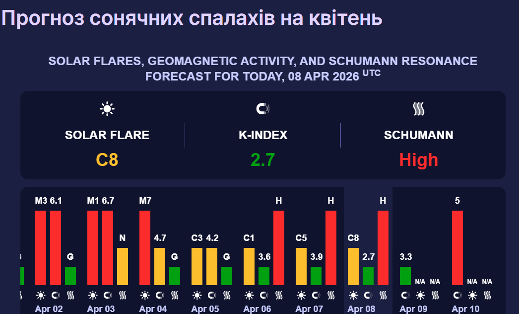 А вже у п'ятницю, 10 квітня, сонячна активність зросте до п'яти балів. Такий К-індекс відповідає магнітній бурі високої потужності. Вона може впливати на здоров’я метеозалежних осіб, викликаючи головний біль, апатію, тривогу та дратівливість.