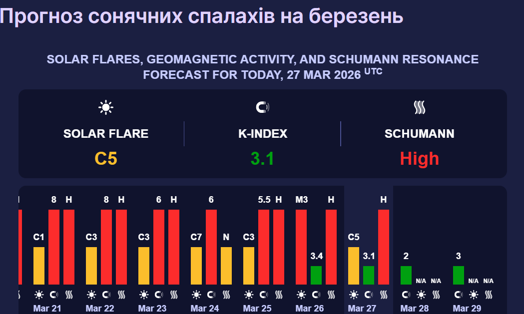 А вже у неділю, 29 березня, сонячна активність зросте до трьох балів. Такий показник також відповідає магнітній бурі зеленого рівня.