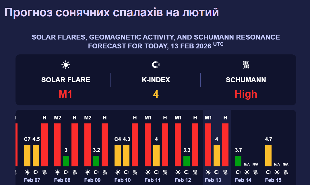 На вихідних, 14 та 15 лютого, потужних магнітних бур не очікується. Геомагнітне поле буде спокійного рівня, а сонячна активність — низькою.