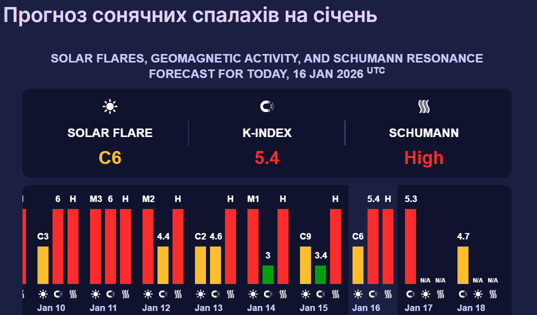 А вже у неділю, 18 січня, космічна погода значно погіршиться, а сонячна активність спаде до 4,7 бала, що відповідає магнітній бурі середнього рівня.