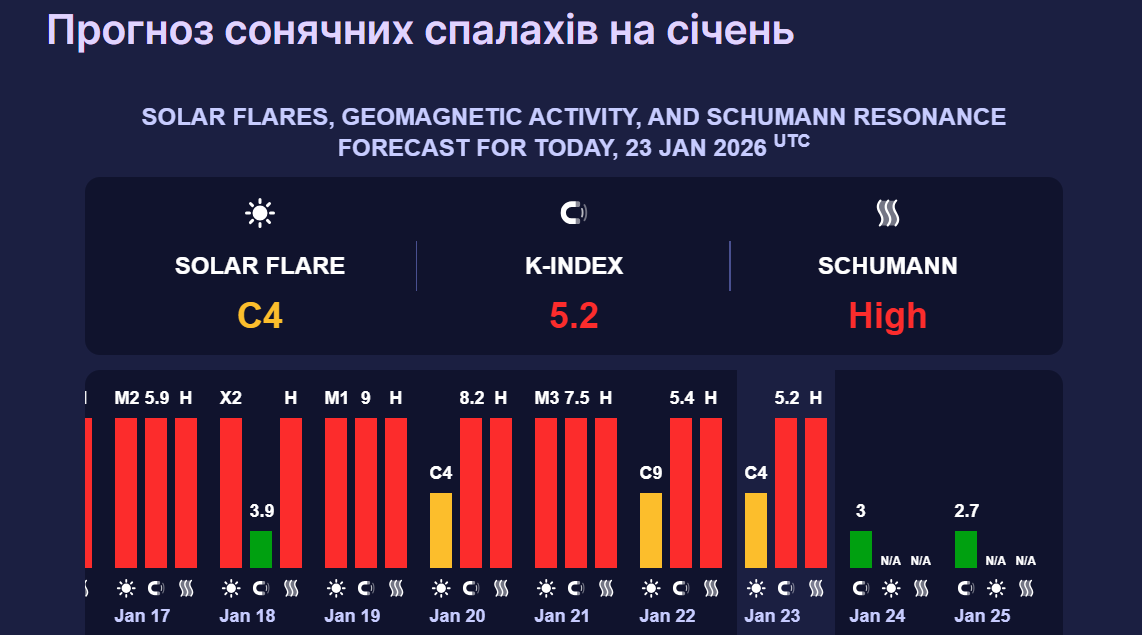 У неділю, 25 січня, космічна погода ще більше покращиться, а сонячна активність становитиме 2,7 бала, що також відповідає магнітній бурі зеленого рівня.