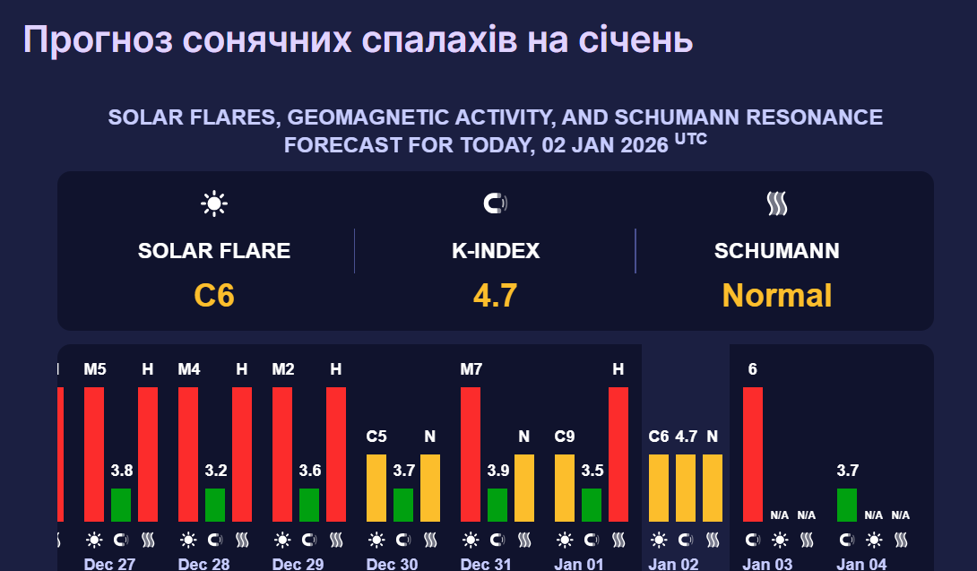 А вже у неділю, 4 січня, сонячна активність спаде до 3,7 бала, що відповідає магнітній бурі зеленого рівня. Такий шторм вважається низьким, тому метеозалежні люди не відчувають його.