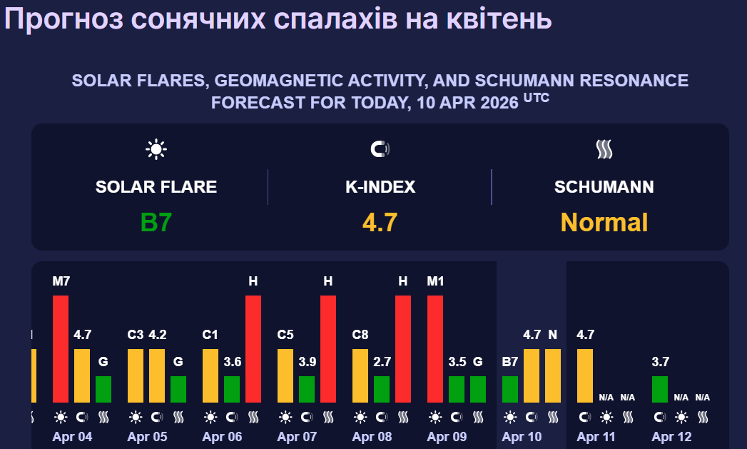 А вже у неділю, 12 квітня, сонячна активність спаде до 3,7 бала. Такий К-індекс відповідає магнітній бурі низької потужності.
