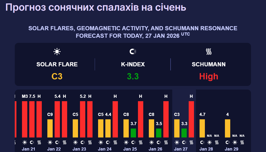 У четвер, 29 січня, космічна погода дещо покращиться, а сонячна активність становитиме чотири бали, що також відповідає магнітній бурі жовтого рівня. Такий шторм може викликати головний біль, апатію або зниження працездатності.
