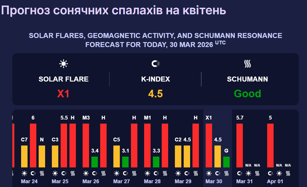 У середу, 1 квітня, сонячна активність спаде до п'яти балів. Такий показник також відповідає магнітній бурі червоного рівня, тож варто більше відпочивати та віддавати перевагу корисній їжі.