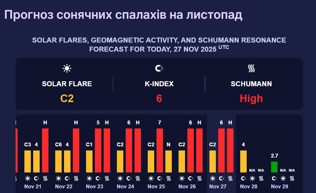 А вже у суботу, 29 листопада, геомагнітні коливання, за попереднім прогнозом, спадуть до 2,7 бала. Така буря вважається низькою і не впливає на самопочуття.