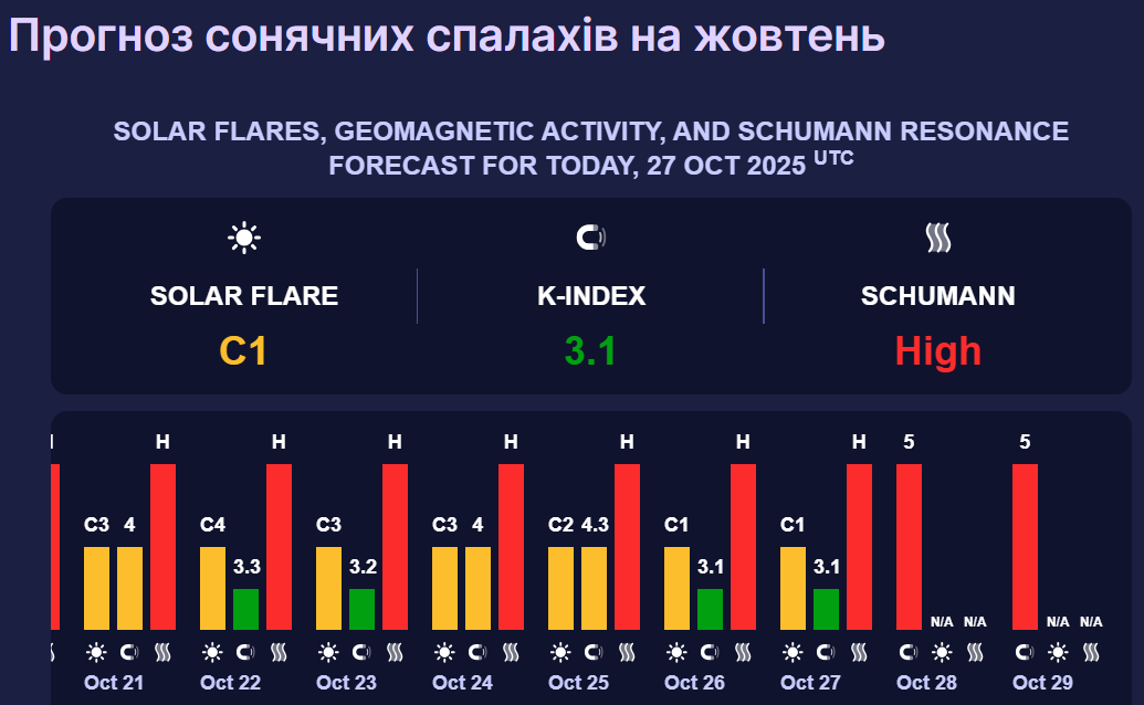 У середу, 29 жовтня, космічна погода буде на аналогічному рівні. Зокрема, магнітні коливання не перевищуватимуть п'ять балів (червоний рівень).