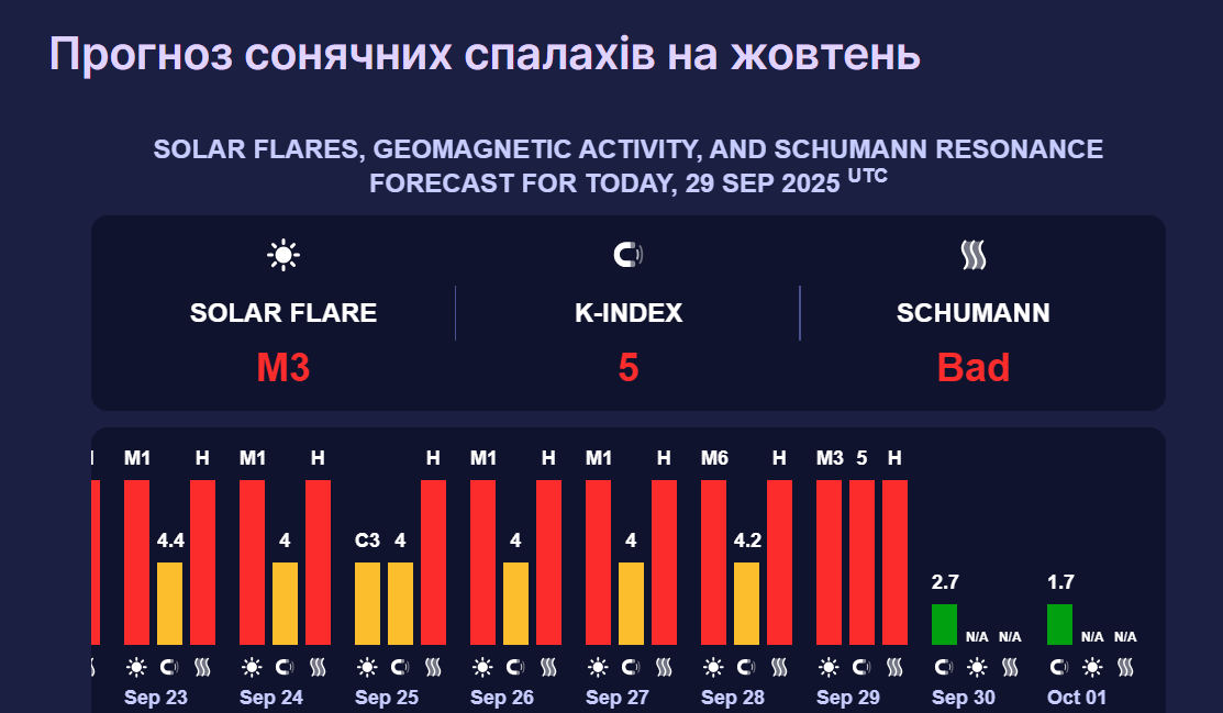 У вівторок, 30 вересня, суттєвих магнітних бур на Землі не очікується. Геомагнітне поле буде спокійного рівня, а сонячна активність — низькою.