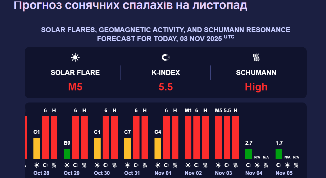 У середу, 5 листопада, космічна погода ще більше покращиться. Зокрема, магнітні коливання не перевищуватимуть 1,7 бала (зелений рівень).