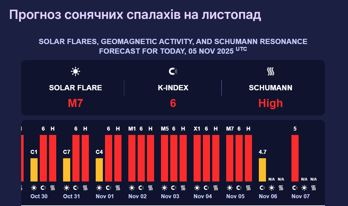 У п'ятницю, 7 листопада, космічна погода ще більше погіршиться. Зокрема, магнітні коливання досягнуть п'ять балів (червоний рівень). Такий шторм може також негативно позначитися на здоров'ї.