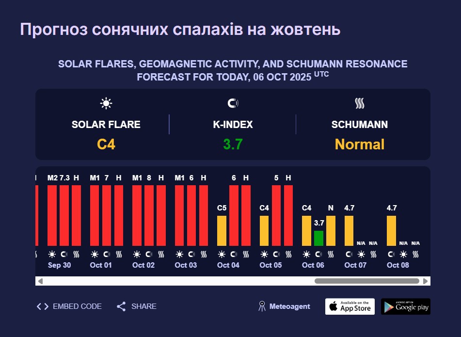 Зокрема, 7 жовтня рівень магнітних коливань збільшиться до 4,7 бала (жовтий рівень). Така сонячна активність вважається середньою та може впливати на самопочуття метеозалежних людей.