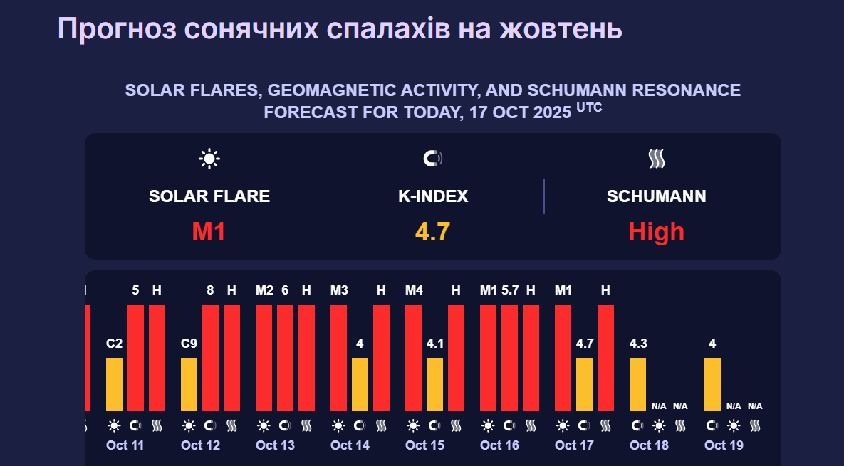 А вже у неділю, 19 жовтня, космічна погода покращиться. Зокрема, магнітні коливання не перевищуватимуть чотирьох балів (жовтий рівень).