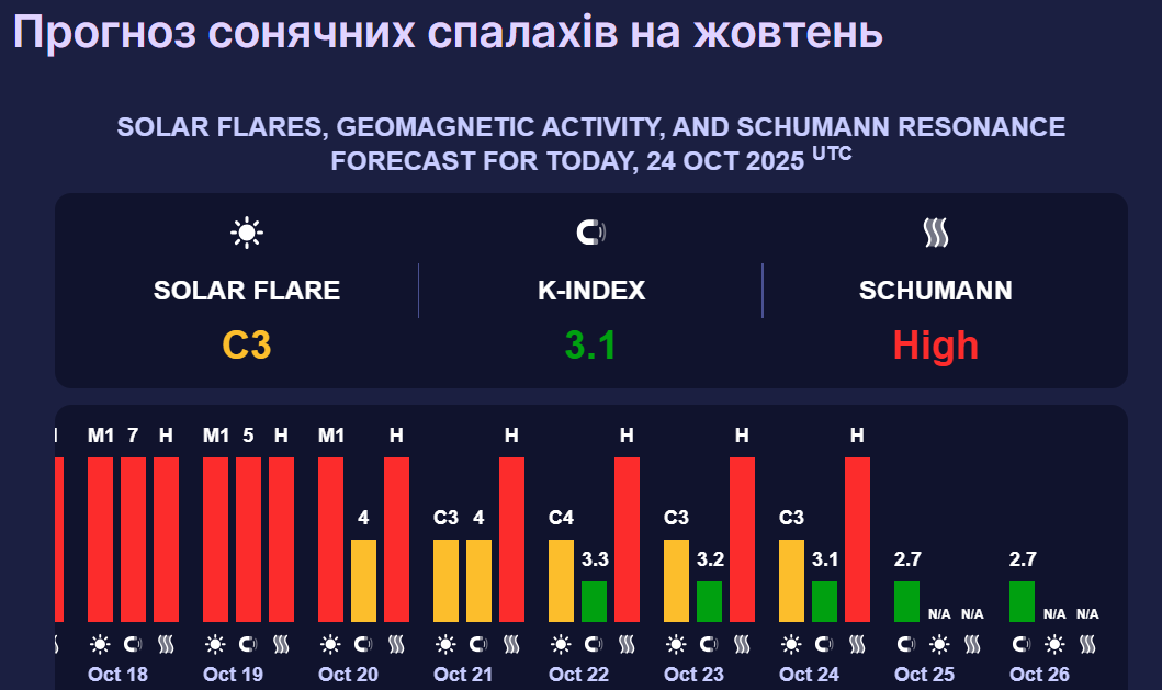 У неділю, 26 жовтня, космічна погода буде на аналогічному рівні. Зокрема, магнітні коливання не перевищуватимуть 2,7 бала (зелений рівень).