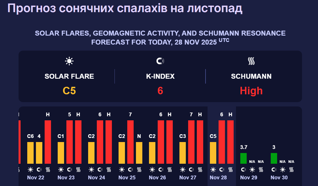 У неділю, 30 листопада, геомагнітні коливання, за попереднім прогнозом, спадуть до трьох балів. Така буря також вважається низькою і не впливає на самопочуття.