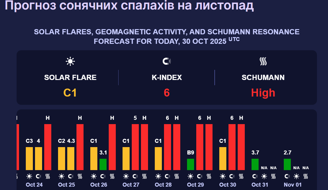 У суботу, 1 листопада, космічна погода ще більше покращиться. Зокрема, магнітні коливання не перевищуватимуть 2,7 бала (зелений рівень).