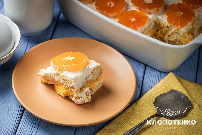 - Формування "Тирамісу": занурити у молоко печиво й викласти на дно прямокутної керамічної форми. Зверху покрити печиво вершковим кремом, а далі мандариновим кудром. Повторити шар печива, далі знов мандариновий курд, а за ним вершковий крем. Останній прошарок прикрасити порізаними на кружечки мандаринами.