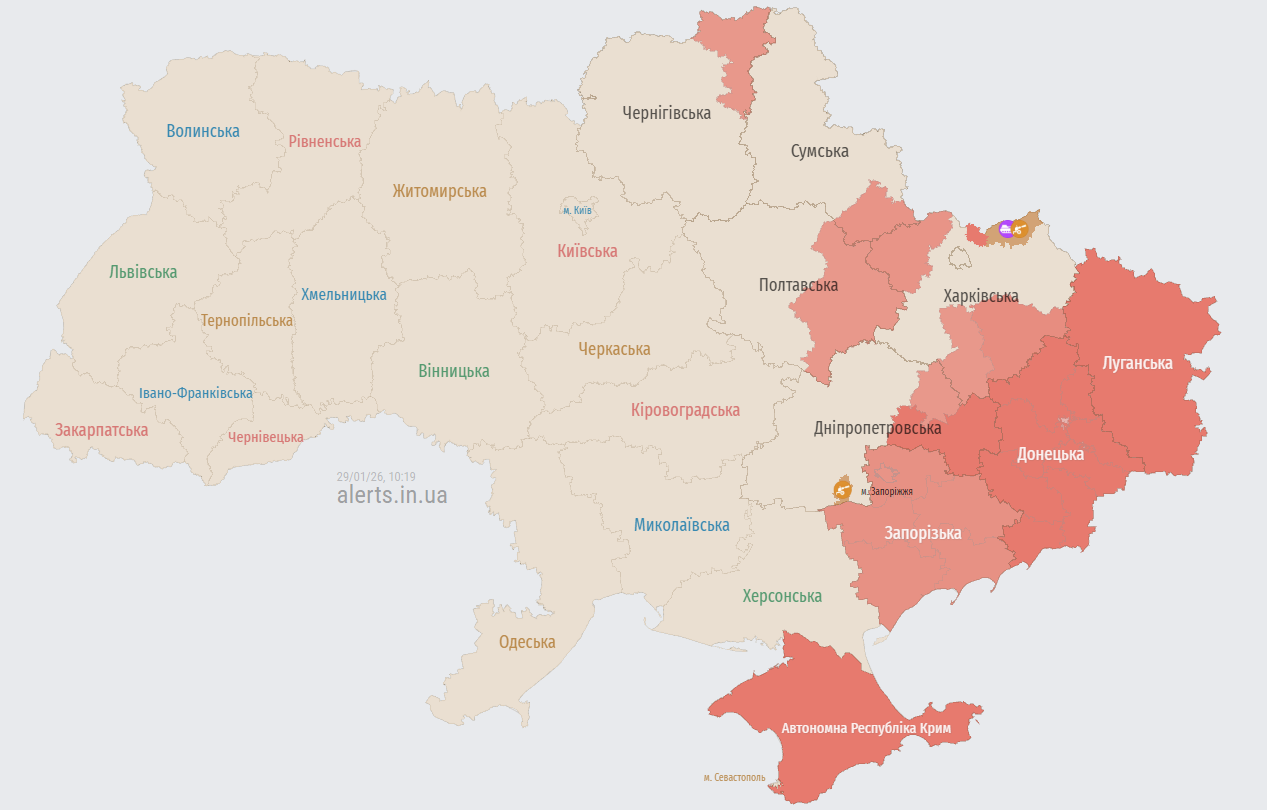 Зранку 29 січня військові фіксують активність ворожих безпілотників у низці регіонів України та удари керованими авіабомбами по Донеччині. Ворожі ударні дрони були помічені на межі Харківської та Сумської областей, де вони постійно змінювали траєкторію руху.
