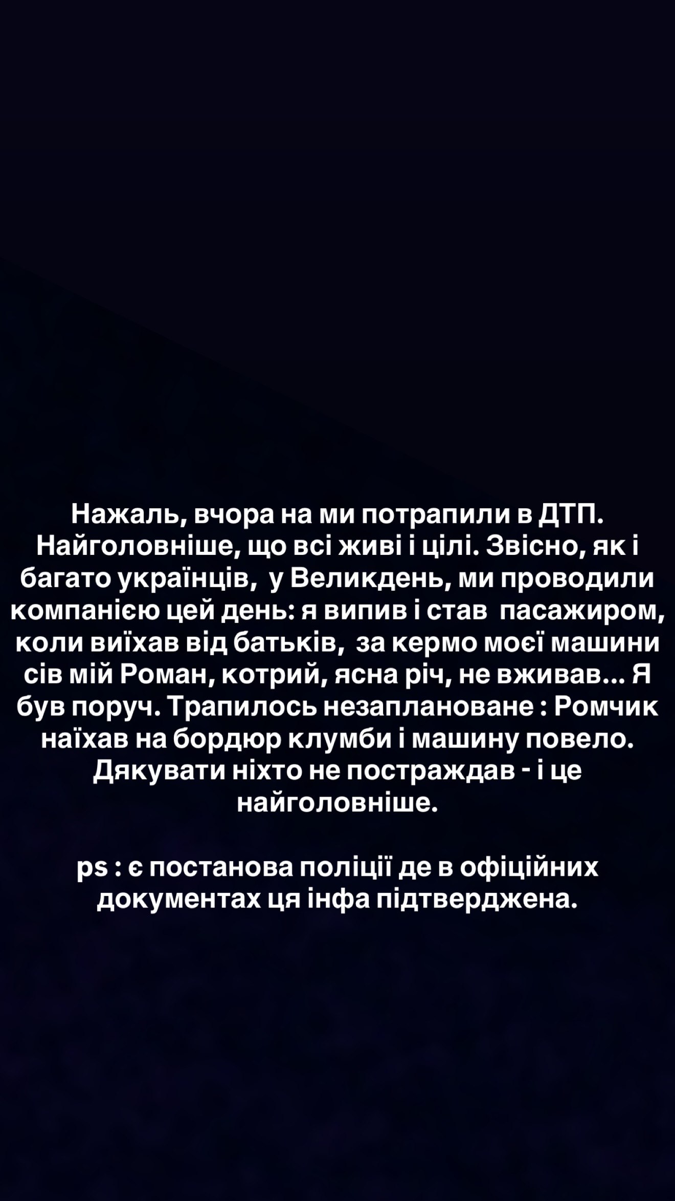 "На жаль, вчора ми потрапили в ДТП. Найголовніше, що всі живі і цілі. Звісно, як і багато українців у Великдень, ми проводили компанією цей день: я випив і став пасажиром, коли виїхав від батьків, за кермо моєї машини сів мій Роман, котрий, ясна річ, не вживав… Я був поруч. Трапилось незаплановане: Ромчик наїхав на бордюр клумби і машину повело. Дякувати ніхто не постраждав — і це найголовніше", — розповів він.