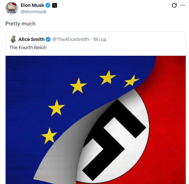 Зараз же Ілон Маск зробив репост допису із зображенням прапора ЄС, під яким приховується стяг Третього Райху. Користувачка, яка й оприлюднила цей допис, додала підпис: "Четвертий Райх". Маск же відреагував: "Значною мірою".