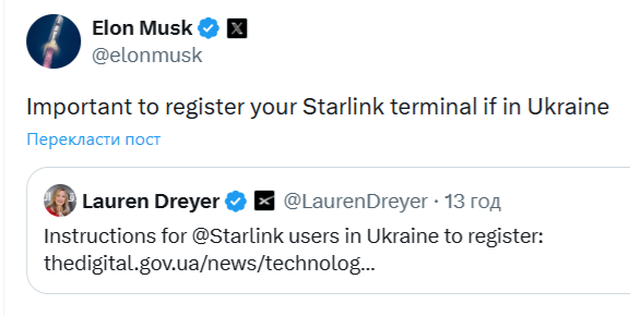 Про це Ілон Маск написав у соціальній мережі X, перепостивши допис віцепрезидентки SpaceX із бізнес-операцій Лорен Дреєр щодо інструкцій з реєстрації терміналів.