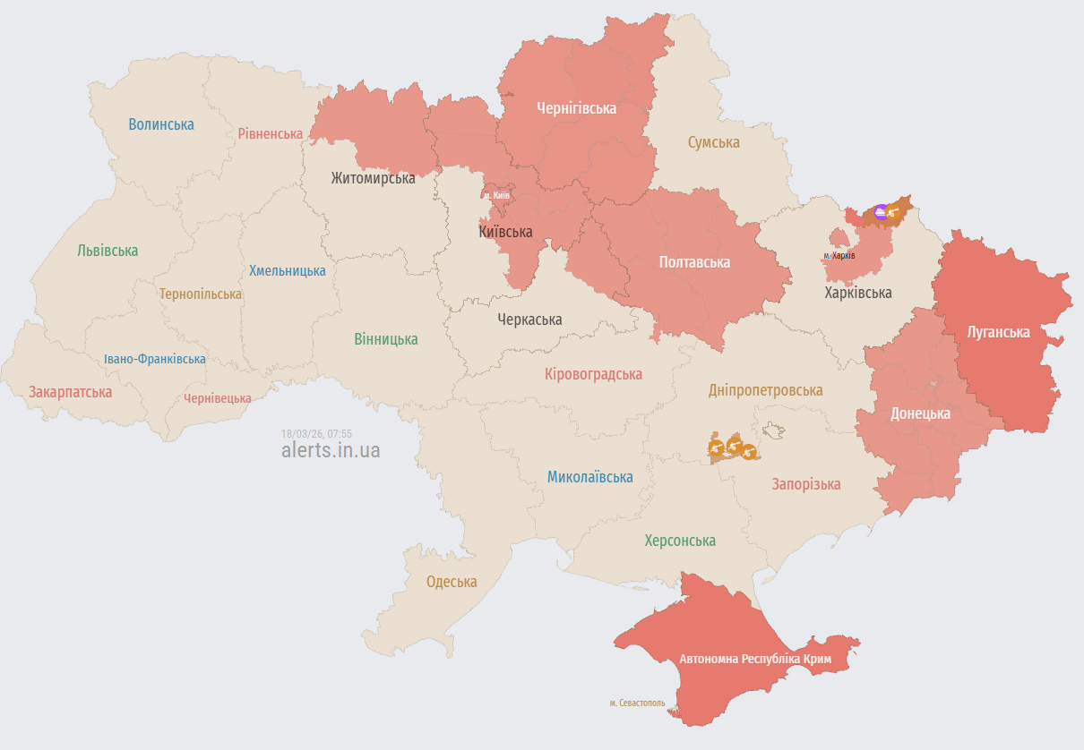 У середу вранці, 18 березня, окупанти здійснюють масовану атаку ударними безпілотниками, намагаючись прорвати оборону в північних та центральних регіонах України. Під ударом Київська, Чернігівська, Сумська та Полтавська області, а ворожі цілі фіксуються безпосередньо на підступах до столиці.