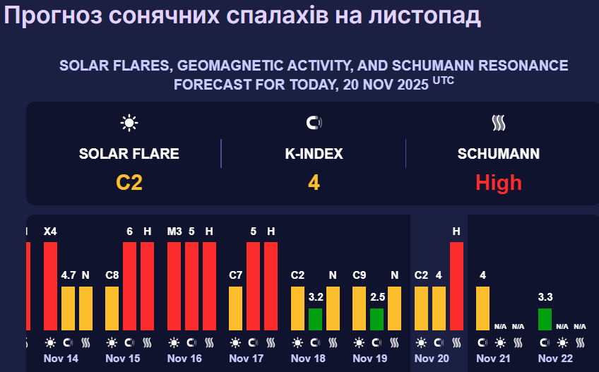 Фахівці прогнозують, що у п'ятницю, 21 листопада, очікуються лише короткочасні збурення магнітосфери та епізодичні слабкі бурі категорії G1. Це найнижчий рівень інтенсивності, який зазвичай є майже непомітним для більшості людей. Загалом, геомагнітне поле має залишитися стабільним без значних і різких стрибків.