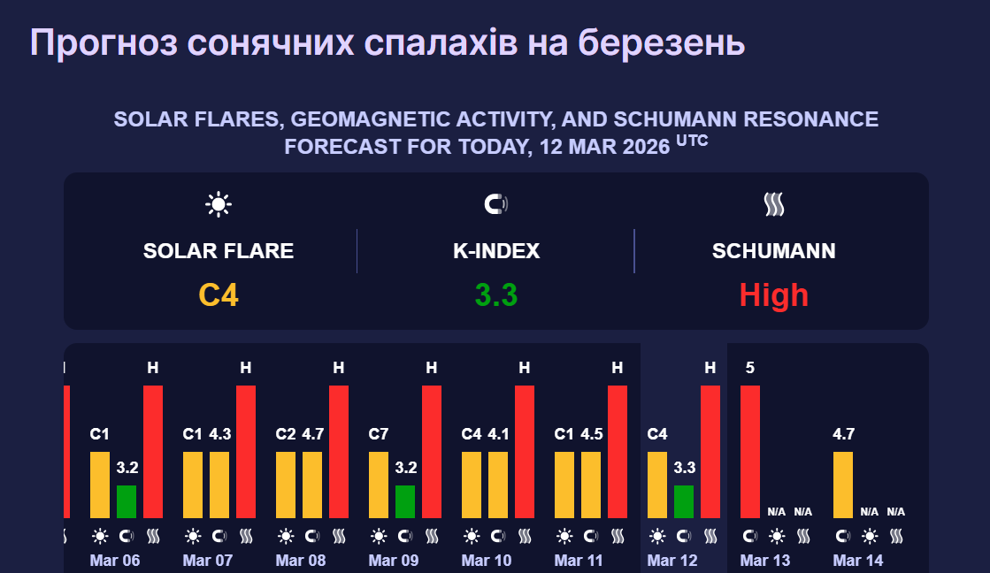 А вже у суботу, 14 березня, сонячна активність спаде до 4,7 бала. Такий показник відповідає магнітній бурі жовтого рівня. Вона також може впливати на самопочуття.