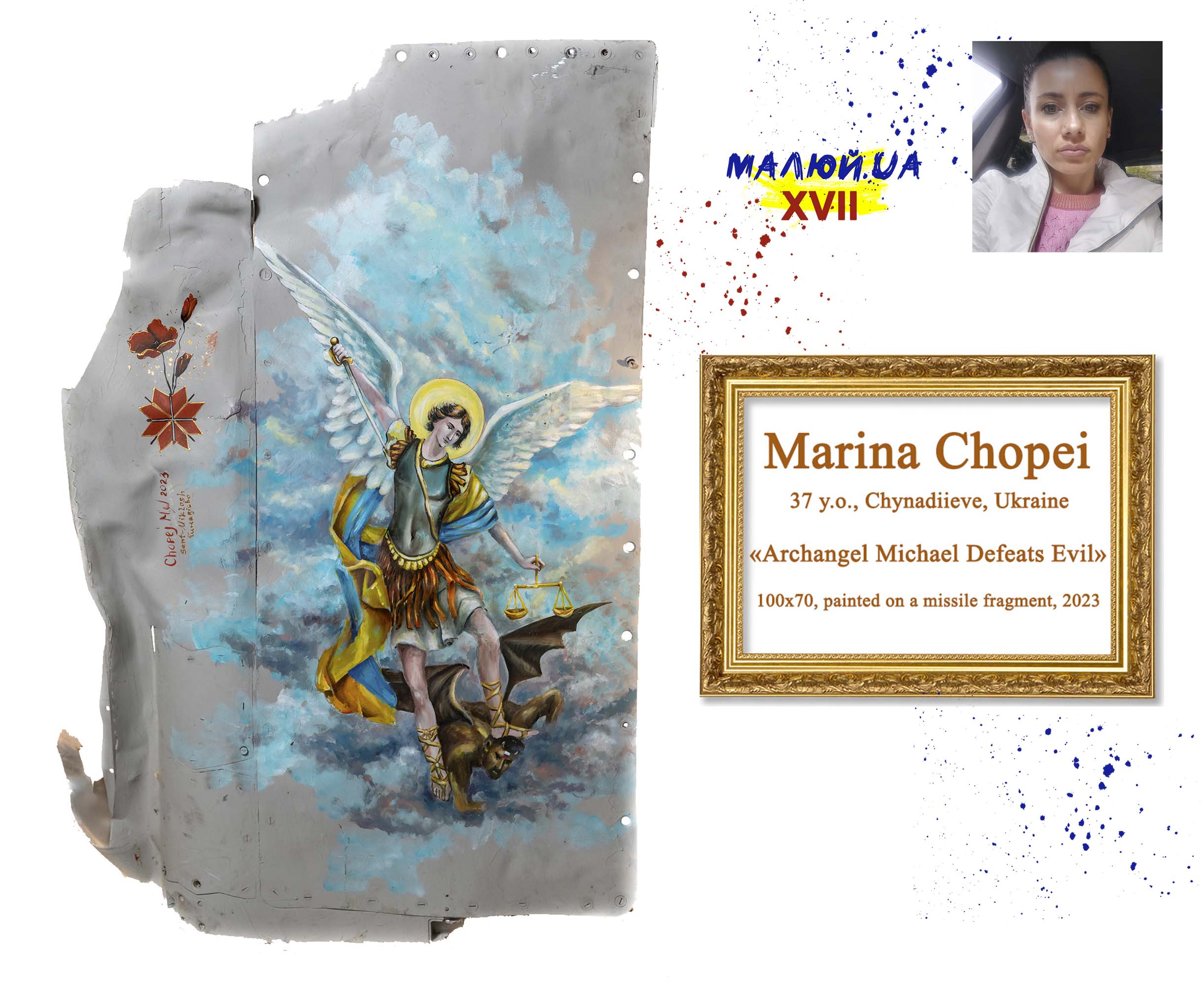 Робота "Архангел Михаїл вбиває зло", 100х70 см, написана на уламку ракети С-300 у 2023 році, взяла участь, зокрема, у виставках артмарафону "Покоління війни" в Києві, Барселоні, Іспанія, та у столиці Греції Афінах.