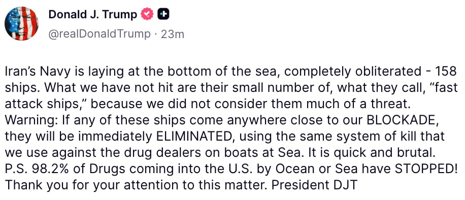 Сполучені Штати Америки розпочали блокаду Ірану. Американський президент Дональд Трамп заявив, що 158 кораблів іранських військово-морських сил нібито "лежать на дні моря" та повністю знищені.
