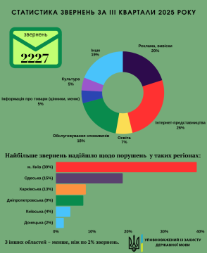 "Понад дві тисячі звернень за три квартали — це не просто цифри, а голоси людей, права яких порушено та які вимагають поваги до своєї мови. Зростання кількості скарг означає, що українці стали уважнішими до свого права отримувати інформацію та послуги державною мовою. Це — показник зрілості суспільства і водночас сигнал усім, хто нехтує законом", — зазначила уповноважена із захисту державної мови Олена Івановська.