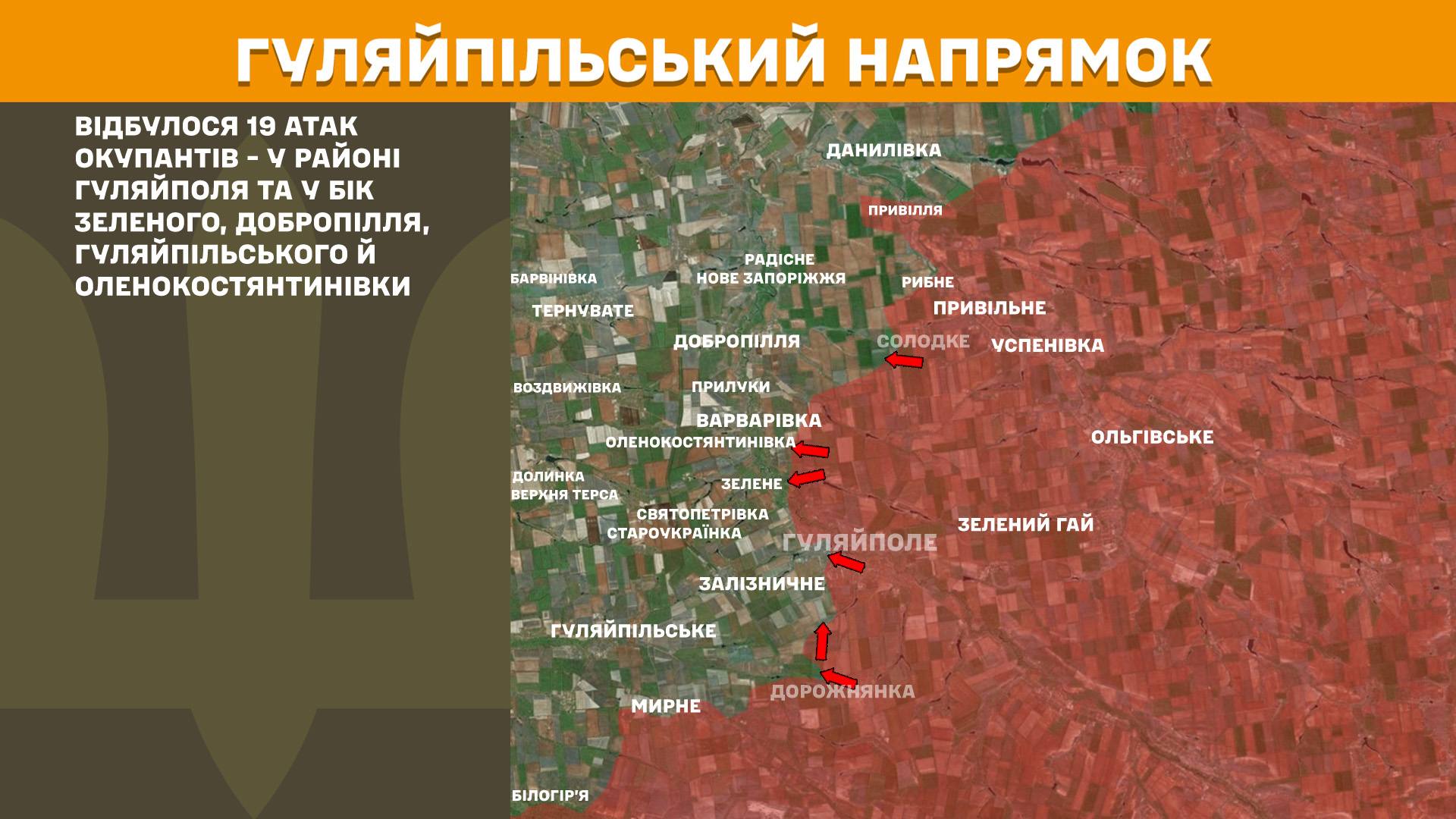 На Гуляйпільському напрямку відбулося 19 атак окупантів — у районі Гуляйполя та у бік Зеленого, Добропілля, Гуляйпільського й Оленокостянтинівки.
