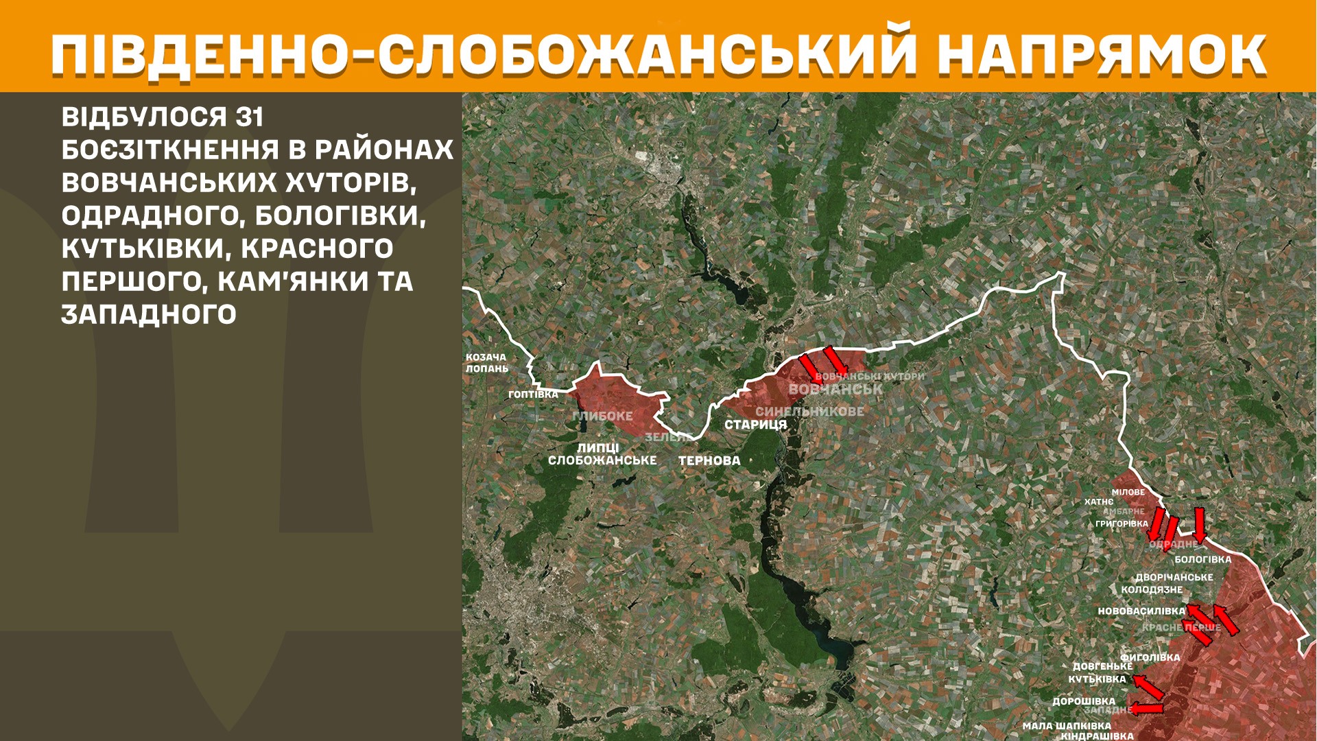 Минулої доби на Південно–Слобожанському напрямку відбулося 31 боєзіткнення в районах Вовчанських Хуторів, Одрадного, Бологівки, Кутьківки, Красного Першого, Кам’янки та Западного.