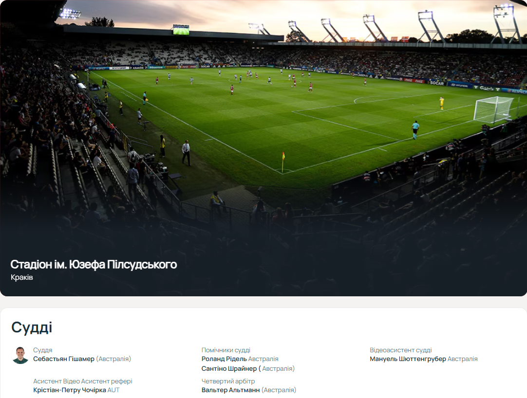 Номінально домашній поєдинок для збірної України у Кракові розсудить бригада суддів з Австрії на чолі з Себастьяном Гісхамером. Його асистентами будуть Роланд Рідель та Сантіно Шрейнер. Четвертим суддею призначено Вальтера Альтманна. Арбітр VAR — Мануель Шуттенгрубер, асистент арбітра VAR — Крістіан-Петру Чокірка.