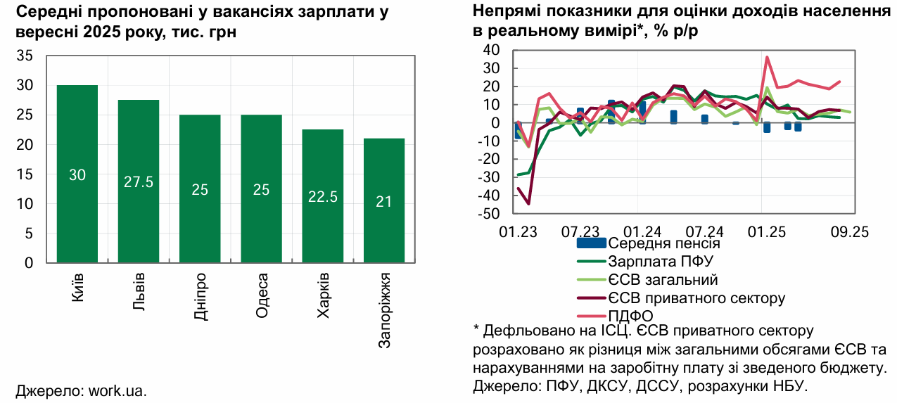 НБУ, посилаючись на дані work.ua, зазначає, що медіанна очікувана (в резюме) зарплата у вересні 2025 року становила 25 тисяч гривень, пропонована (у вакансіях) була дещо вищою — 25 500 гривень. До того ж у річному вимірі зростання медіанної номінальної зарплати сповільнилося (з 19% у серпні до 16% у вересні).